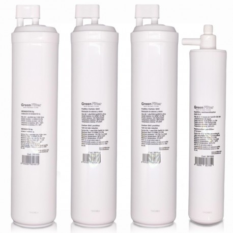 Kit 4 filtros recambio osmosis inversa green filter tipo CS con post filtro CS y membrana Garantía de carbón activo (CALGON) de máxima calidad certificado UNE EN 12915-1. Calidad y Fiailidad para soportar hasta 8,6 bar Para toda la gama Ionfilter, Ultra, Elba, Pallas, Sintra, Magma2, Eco box, Lady Water, CM cs, Direct Life