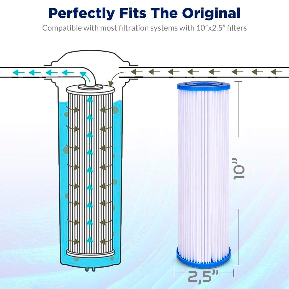 Este cartucho de 10" (longitud) x 2,5" (diámetro exterior) x 1,1" (diámetro interior) es compatible con la mayoría de las carcasas de 10" para sistemas de filtración: