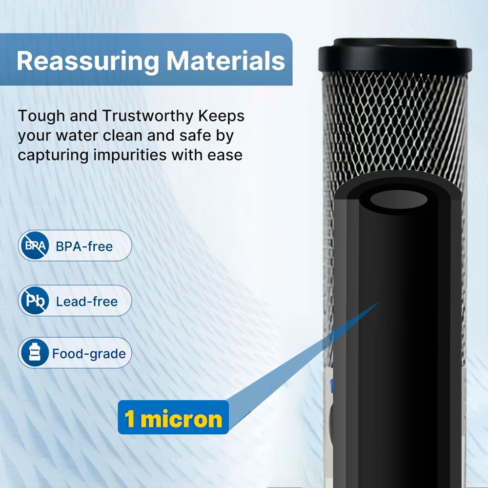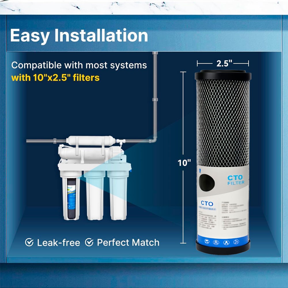 Cartucho de carbón extrusionado CTO 10" x 2,5" – 1 micra con CERTIFICACIÓN NSF/ROHS. Filtro de tercera etapa para sistemas de ósmosis inversa. Reduce hasta el 99% de cloro, sedimentos, arena, óxido y color. Certificado NSF, ROHS, REACH, EC1935-2004 y libre de BPA. Compatible con sistemas estándar 10". Filtra hasta 13.000 galones. Fácil instalación.