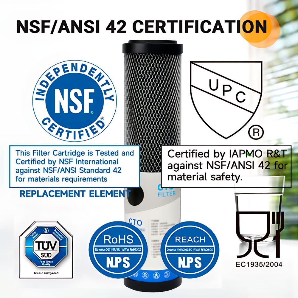 El cartucho de carbón extrusionado CTO 10" x 2,5" de 1 micra con CERTIFICACIONES NSF, ROHS, REACH Y EC1935-2004 es la elección profesional para la tercera etapa de su sistema de ósmosis inversa. Sus múltiples certificaciones internacionales, alta capacidad de filtración y facilidad de instalación garantizan agua de excelente sabor y calidad para toda la familia.