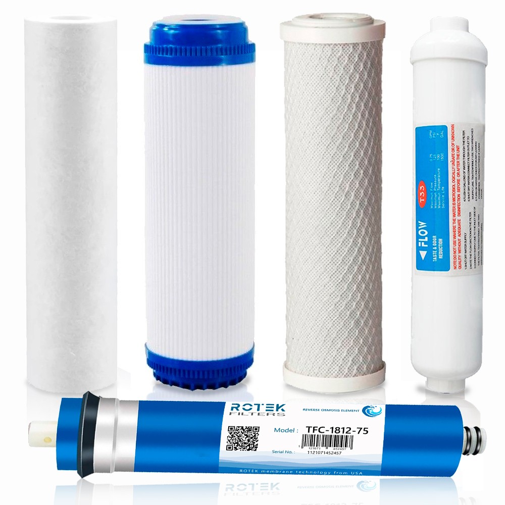 Recambios completos para mantenimiento de sistemas de ósmosis inversa domésticos de 5 etapas o vasos universales. Incluye filtros de sedimento, carbón GAC, CTO, posfiltro y membrana ROTEK 75 GPD. Manual completo de mantenimiento incluido.