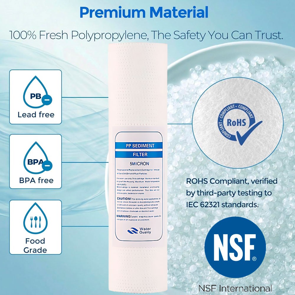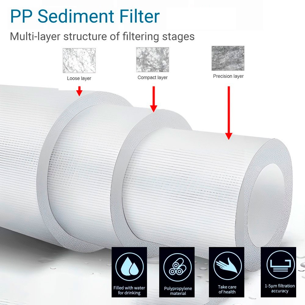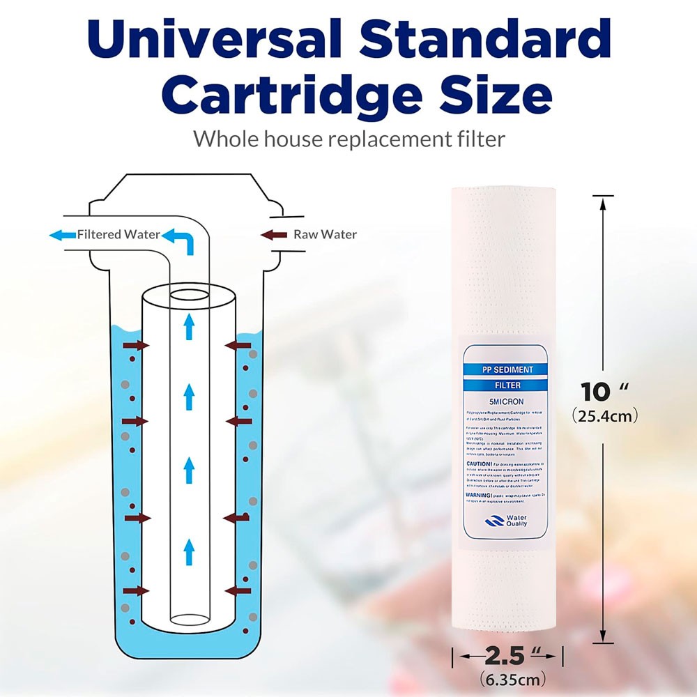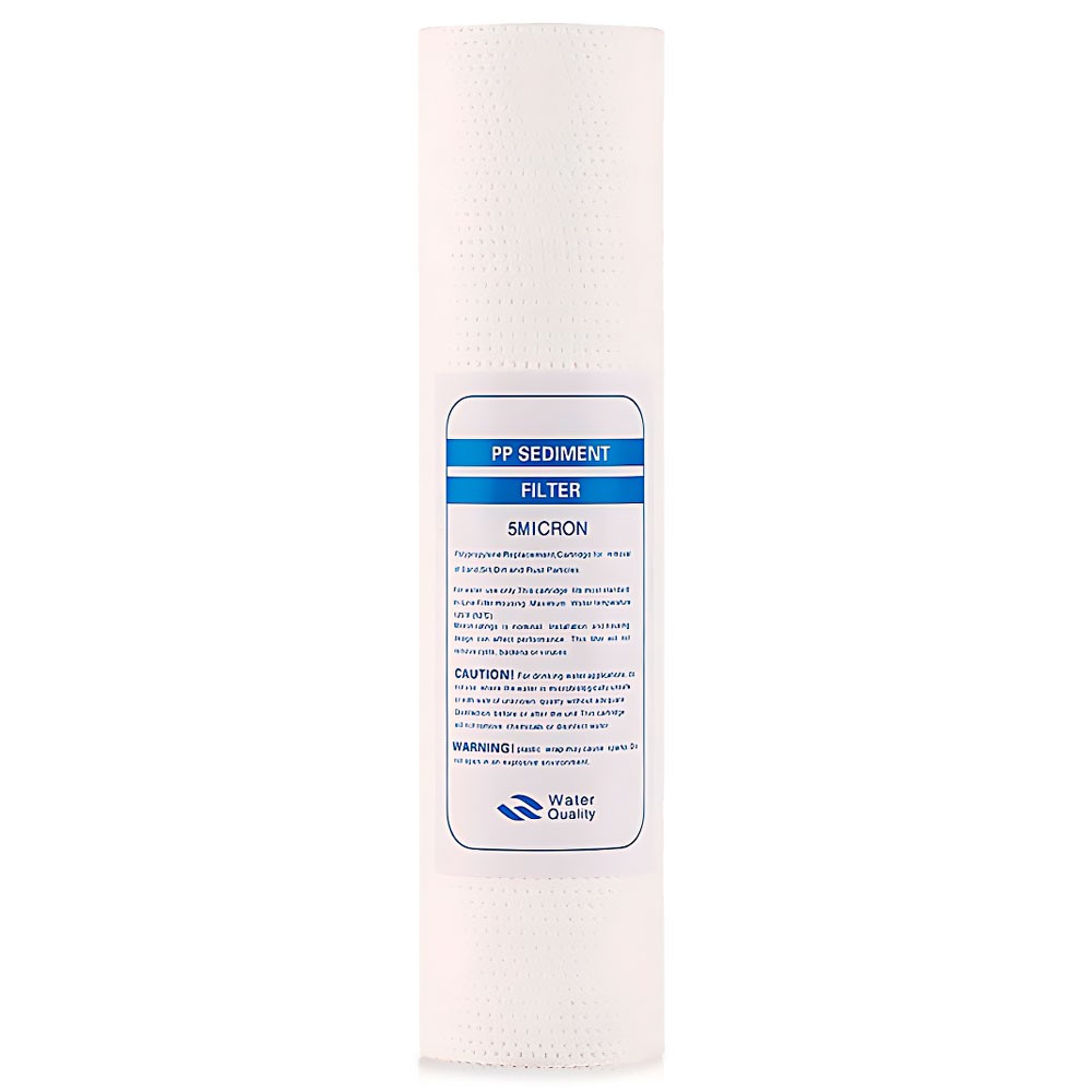 Cartucho filtrante de polipropileno 2,5" x 10" – 5 micras. Certificado NSF/ISO9001 y libre de BPA. Elimina el 99% de sedimentos (óxido, arena, limo) protegiendo tus equipos de agua. Tecnología fundida por soplado sin desprendimiento de fibras. Compatible con carcasas estándar 10". Duración aproximada 6 meses.