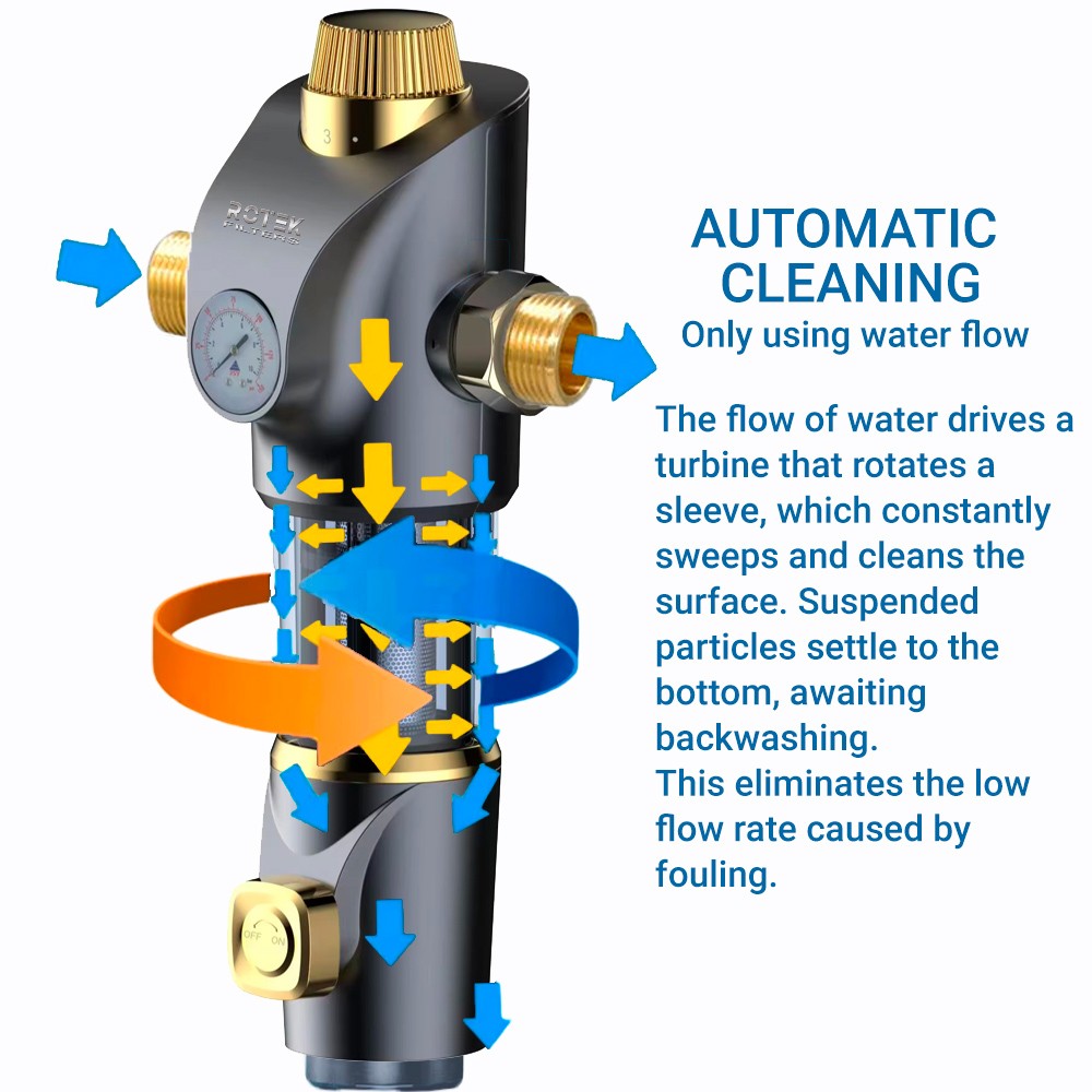 Filtración realizada mediante dirección del flujo inteligente con barrido automático, aprovechando el caudal del agua, para evitar las incrustaciones en el filtro y que se deteriore su capacidad de filtración.