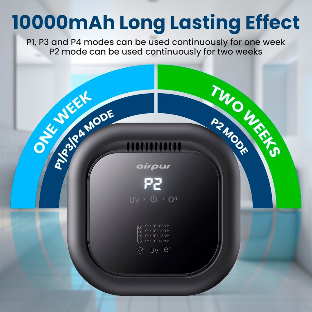 Airpur Generador Ozono 100 mg/h - Purificador 4en1: ozono, luz UV, iones negativos y aromaterapia. Elimina el 99% de olores (tabaco, mascotas, cocina), bacterias y polvo. Ideal 5-40m². Batería 5000mAh, silencioso 35dB, modos automáticos. Sin cables, uso continuo.