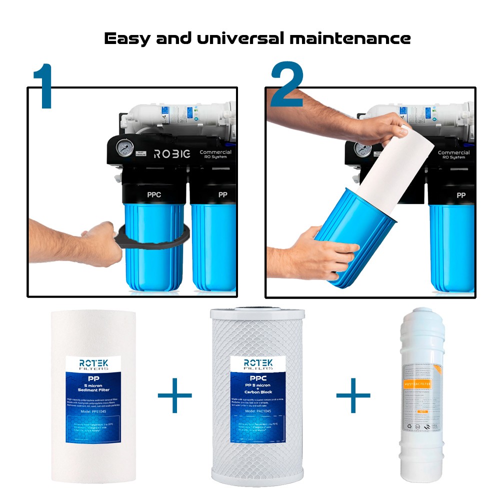 Cambio de prefiltros cada 6-12 meses, membrana cada 2-3 años, y postfiltro cada 12 meses.