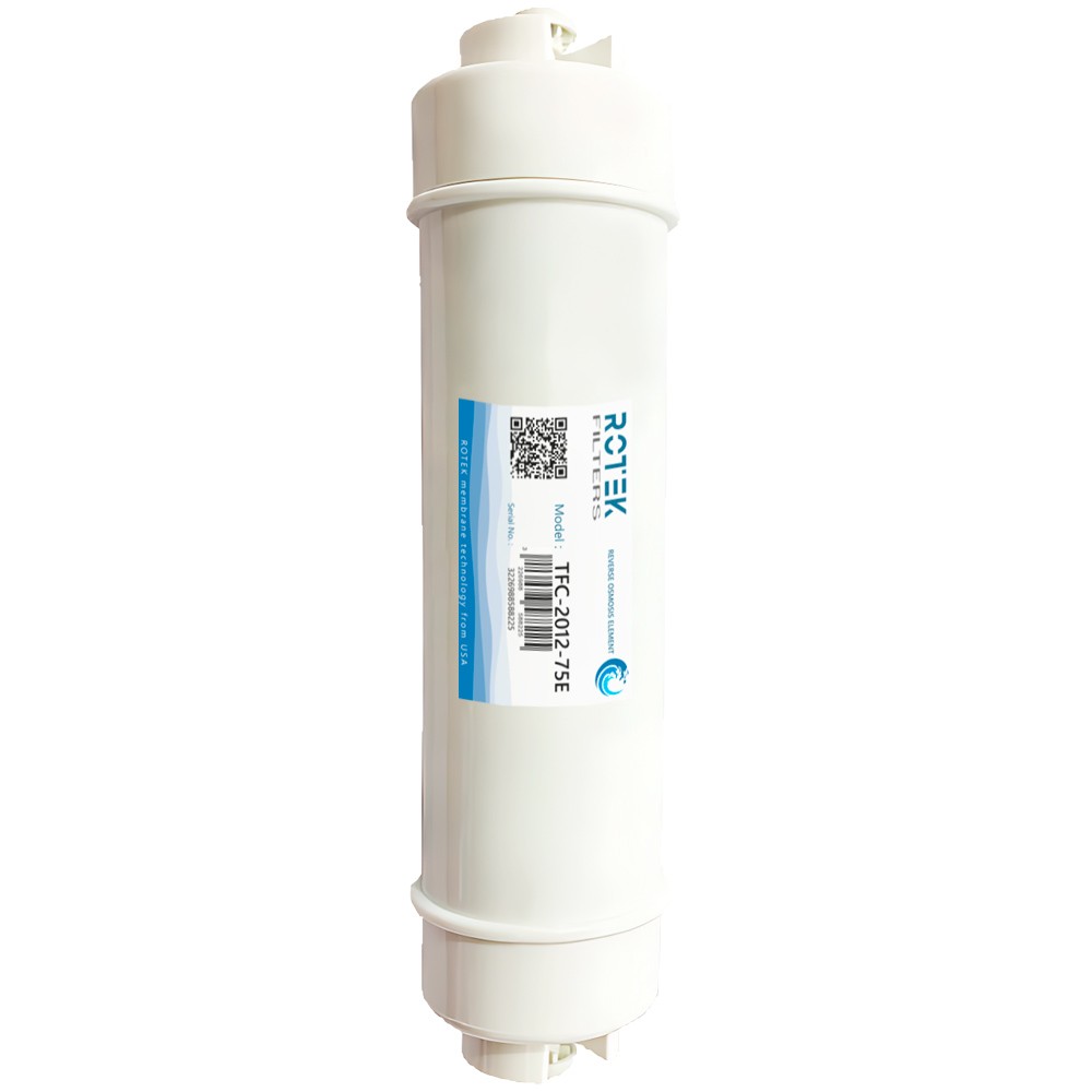 Membrana encapsulada ROTEK 75 GPD con película Vontron premium. Diseñada para dispensadores de agua fría/caliente y sistemas de ósmosis inversa. Conexión rápida espiga 1/4", 97% eficiencia rechazo sales. Instalación plug & play.