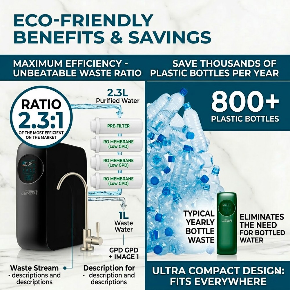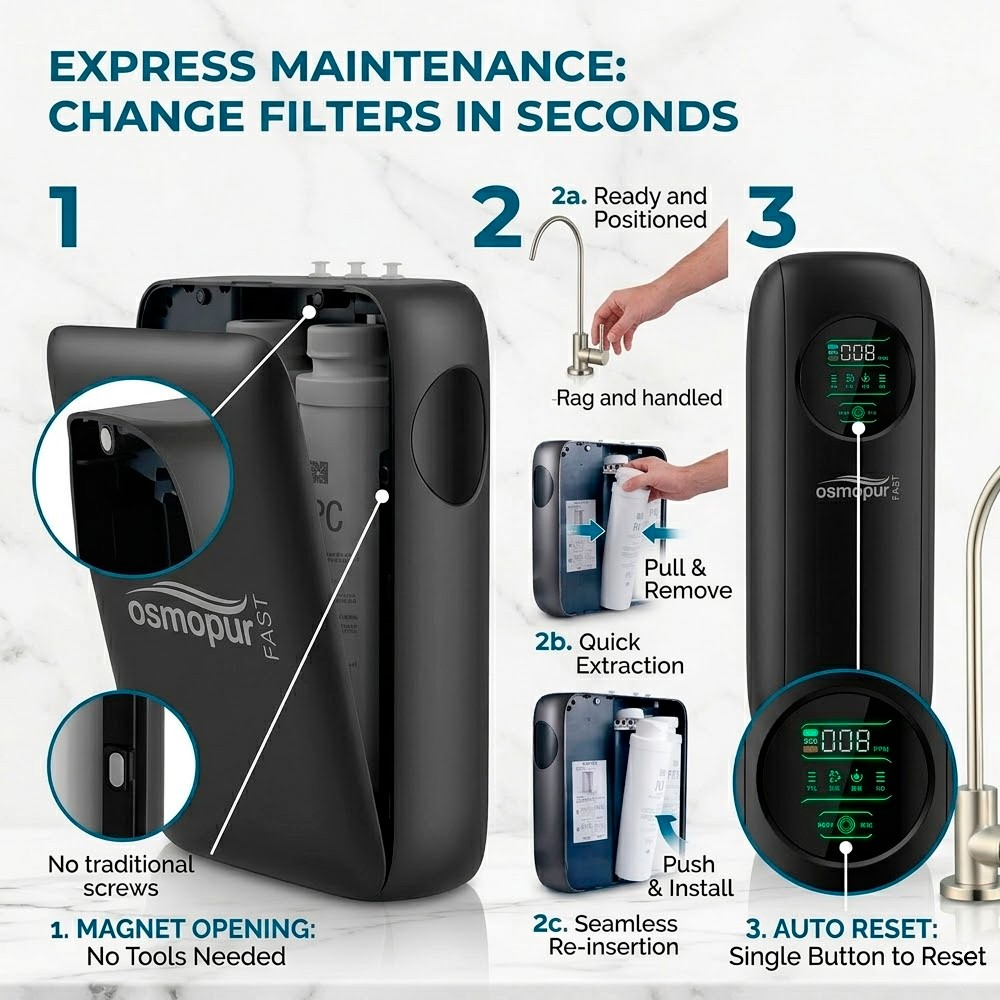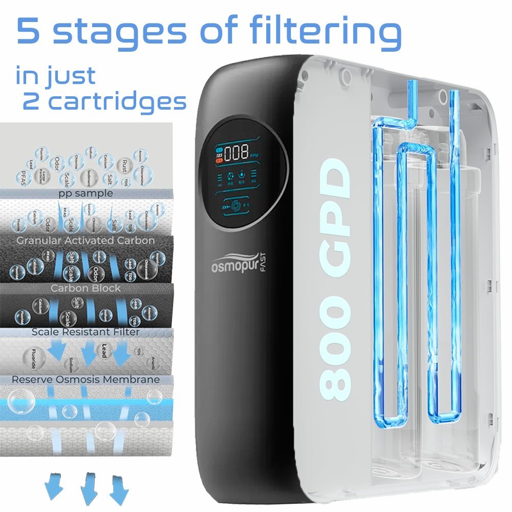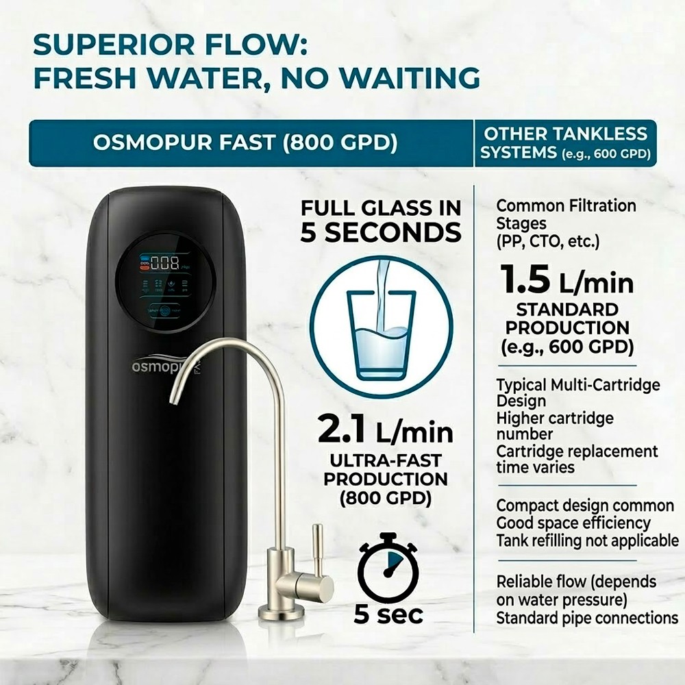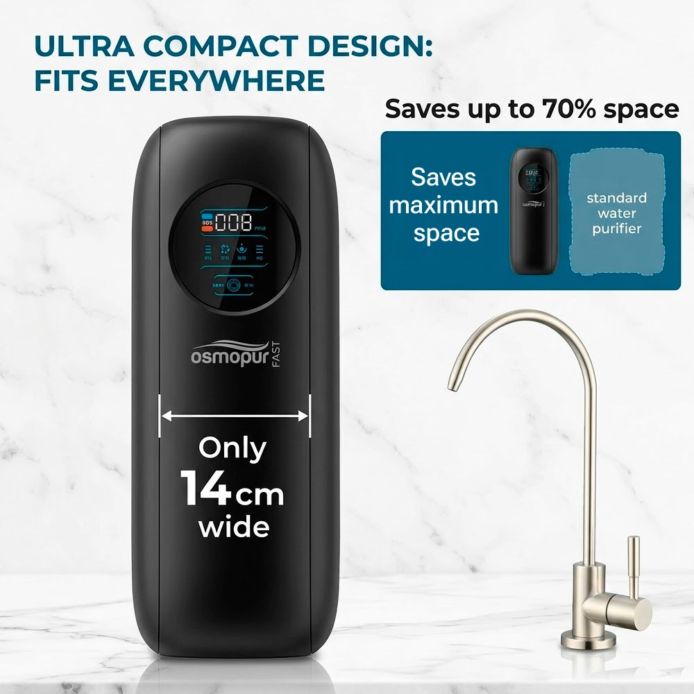Ósmosis OSMOPUR FAST 800 GPD: Agua pura al instante sin depósito. Solo 14 cm de ancho, producción de 2,1L/min y ratio 2,3:1 de eficiencia. Cambio de filtros en segundos sin herramientas. ¡La más rápida del mercado!