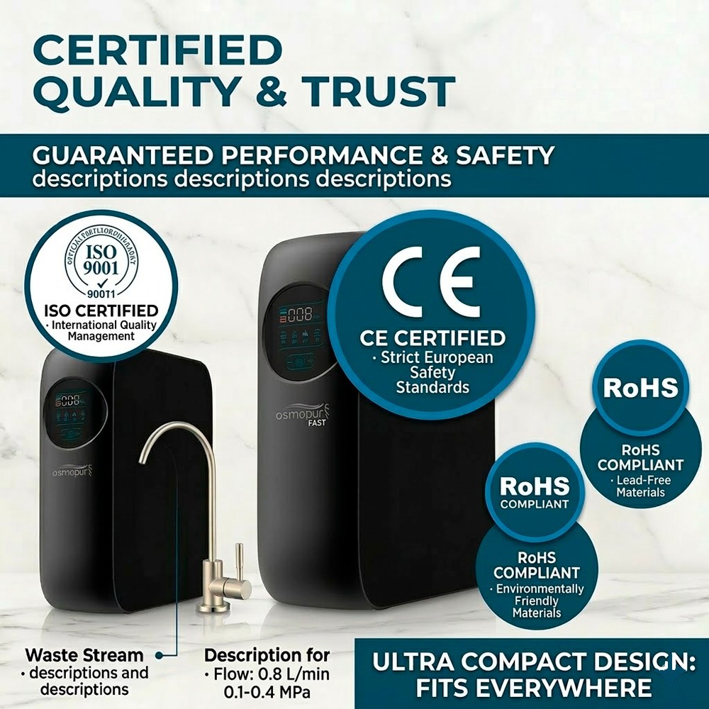 Ideal para cocinas modernas con espacio limitado. OSMOPUR FAST combina velocidad de producción con diseño ultra compacto, ofreciendo agua pura al instante sin sacrificar espacio.