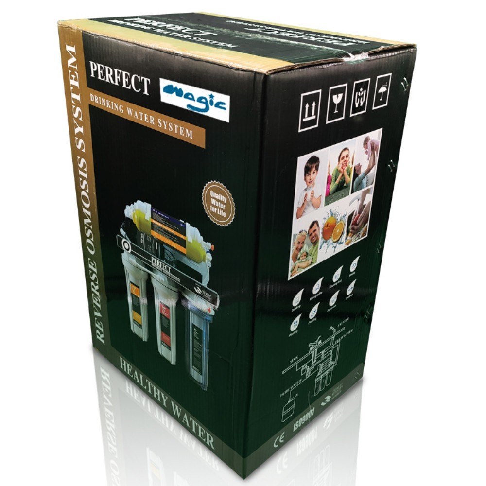 El filtro por osmosis inversa MAGICBUV consta de varias etapas de filtrado. La primera etapa es un filtro de turbiedad de 5 micras (14 veces menos el diámetro de un cabello) que es capaz de eliminar cualquier elemento en suspensión en el agua como arena, óxido y cualquier tipo de materia orgánica. La segunda etapa es un filtro de carbón GAC capaz de eliminar cualquier elemento que tenga sabor y olor del agua, como el cloro. La tercera etapa es un filtro combinado de carbón extrusionado y malla filtrante para eliminar cualquier elemento final antes de la membrana.La cuarta etapa es la bomba booster que garantiza una alta presión de agua para la mejor producción de la membrana. La quinta etapa es el corazón del sistema, la membrana de ósmosis donde se elimina el 97% de todos los elementos disueltos en el agua, obteniendo un agua de altísima calidad y baja mineralización. En esta etapa se rechaza el agua necesaria para eliminar dichos elementos disueltos de manera que no obturen la membrana. De aquí se acumula en el depósito de agua poco a poco para que siempre tenga a su disposición 5 litros de agua pura y cristalina. La última etapa es el posfiltro de carbón de coco que es el encargado de equilibrar el ph del agua y eliminar cualquier posible sabor antes del consumo. Y de aquí directamente al grifo dispensador.