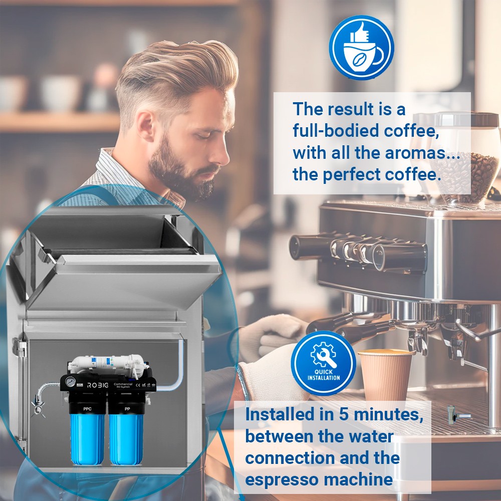 El sistema ROBIG Coffee transforma aguas con exceso de sales en un agua perfectamente equilibrada, ideal para extraer los mejores aromas y sabores del café espresso, además de proteger las calderas y válvulas de la cafetera frente a la cal.