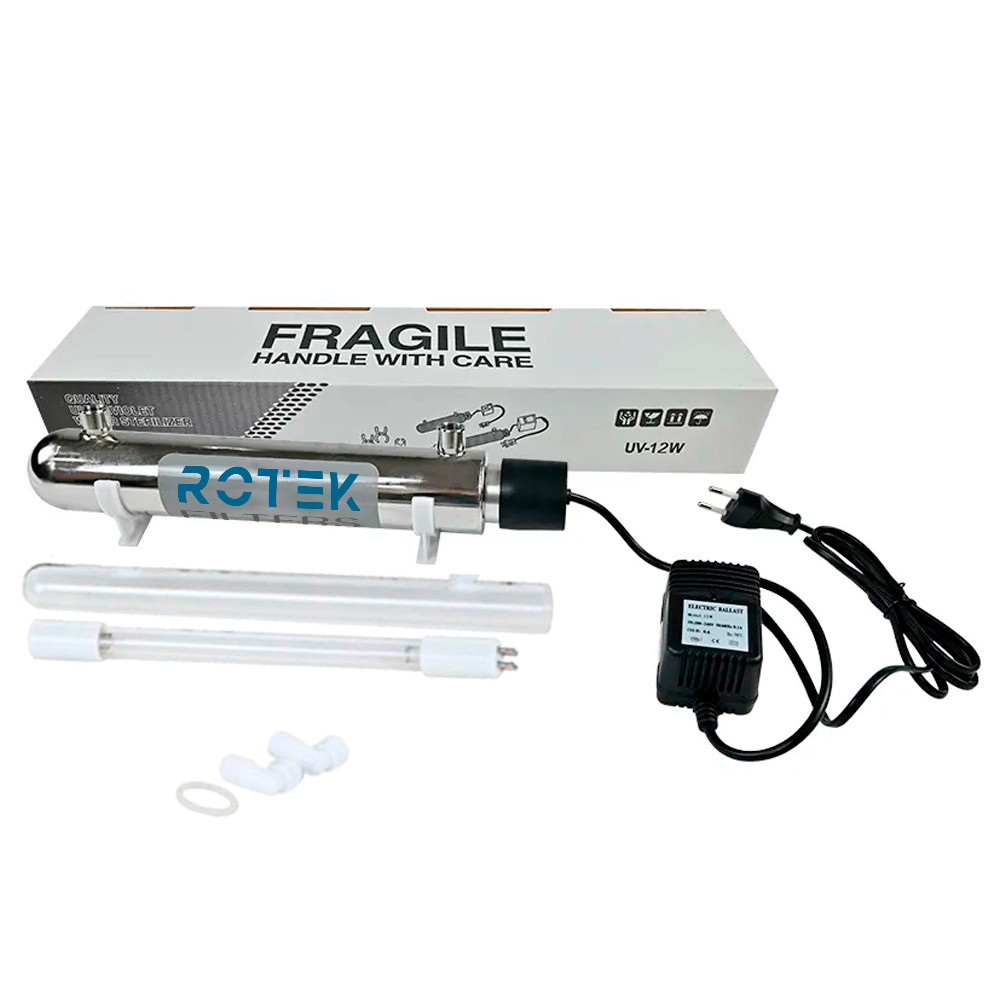 Esterilizador ultravioleta ROTEK 12W. Acero inoxidable 304, caudal 226L/h. Elimina 99.9% bacterias. Ideal para ósmosis, acuarios y agua filtrada. ¡Garantía bacteriológica!